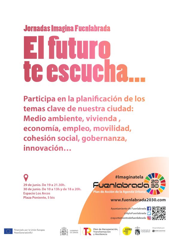 Durante los días 29 y 30 de junio, el Espacio Joven la Plaza acoge las jornadas Imagina Fuenlabrada, un evento abierto a la ciudadanía con el objetivo de que participen en el plan ‘Fuenlabrada 2030’ que permitirá planificar y diseñar la ciudad de forma integral y participativa.