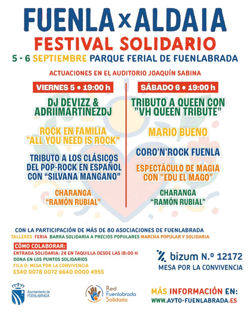 Fuenlabrada ha organizado, a través de la Red Fuenlabrada Solidaria y en concreto con la Mesa por la Convivencia, el primer Festival Solidario “Fuenla x Aldaia” que se celebrará los días 5 y 6 de septiembre en el Auditorio Joaquín Sabina del Parque Ferial.