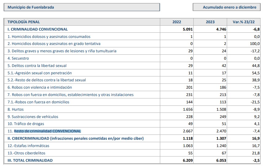 Los datos del Ministerio se dividen en criminalidad convencional y en cibercriminalidad. Dentro del primer apartado encontramos 11 tipologías penales diferentes. De esas 11 tipologías, en Fuenlabrada se han producido descensos de los casos en seis de ellas: Delitos graves y menos graves de lesiones y riña tumultuaria, Robos con violencia e intimidación, Robos con fuerza en domicilios, establecimientos y otras instalaciones, Robos con fuerza en domicilios, Hurtos y Resto de criminalidad CONVENCIONAL.