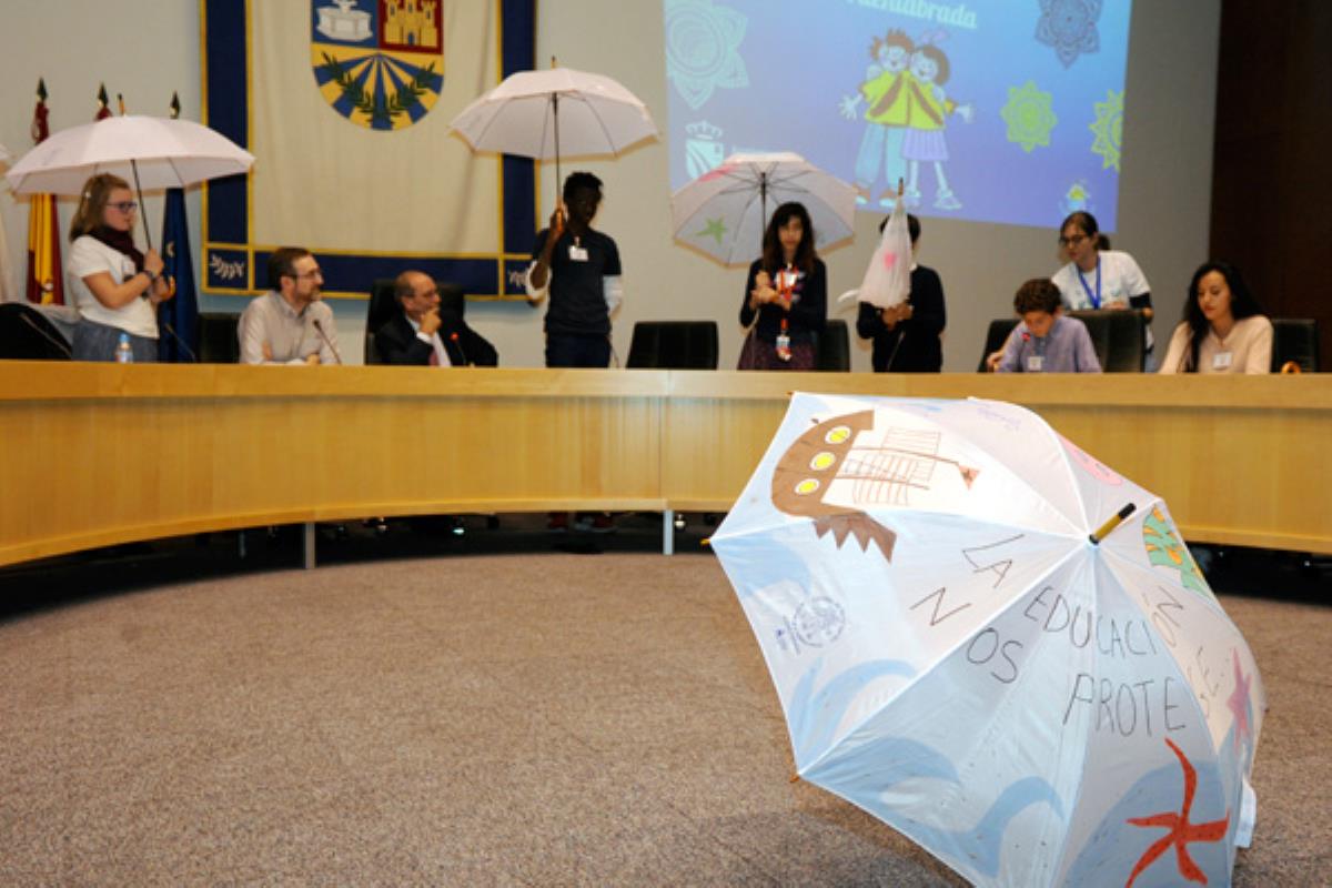 Durante el mencionado pleno, los consejeros presentaron su plan de trabajo para 2017, centrado en la educación. Para visualizar mejor sus reivindicaciones, cada uno de los menores abrió un paraguas con palabras y conceptos relacionados con su derecho a la educación.