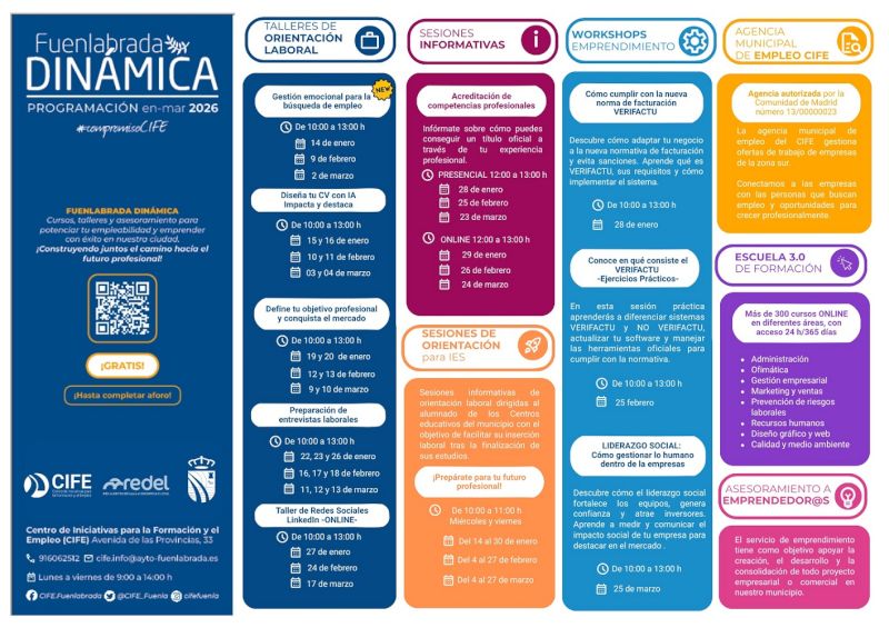 El Ayuntamiento, a través del CIFE, presenta una nueva oferta del programa formativo trimestral de apoyo al desarrollo económico y el empleo ‘Fuenlabrada Dinámica’. Se trata de actividades y eventos de carácter formativo y divulgativo diseñados para multiplicar las posibilidades de inserción laboral, aprendizaje, apoyo al emprendimiento, la economía social y al trabajo colaborativo entre empresas y profesionales.