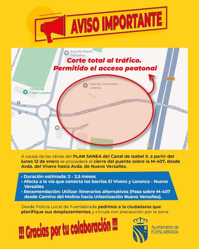 Este puente se cierra este lunes 12 de enero durante un periodo estimado de dos o dos meses y medio. Por este motivo, desde el Ayuntamiento de Fuenlabrada recomiendan utilizar como itinerario alternativo el paso sobre la M-407 del Camino del Molino, junto al estado Fernando Torres.