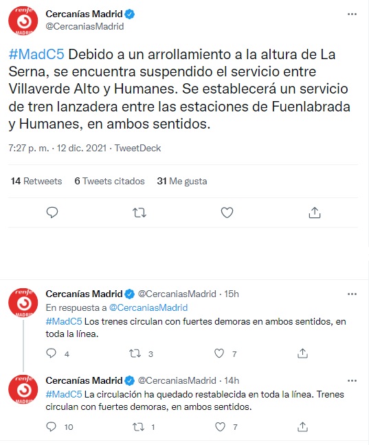 Renfe Cercanías Madrid informaba este domingo 12 de diciembre de la interrupción de la circulación debido a un arrollamiento a la altura de La Serna.