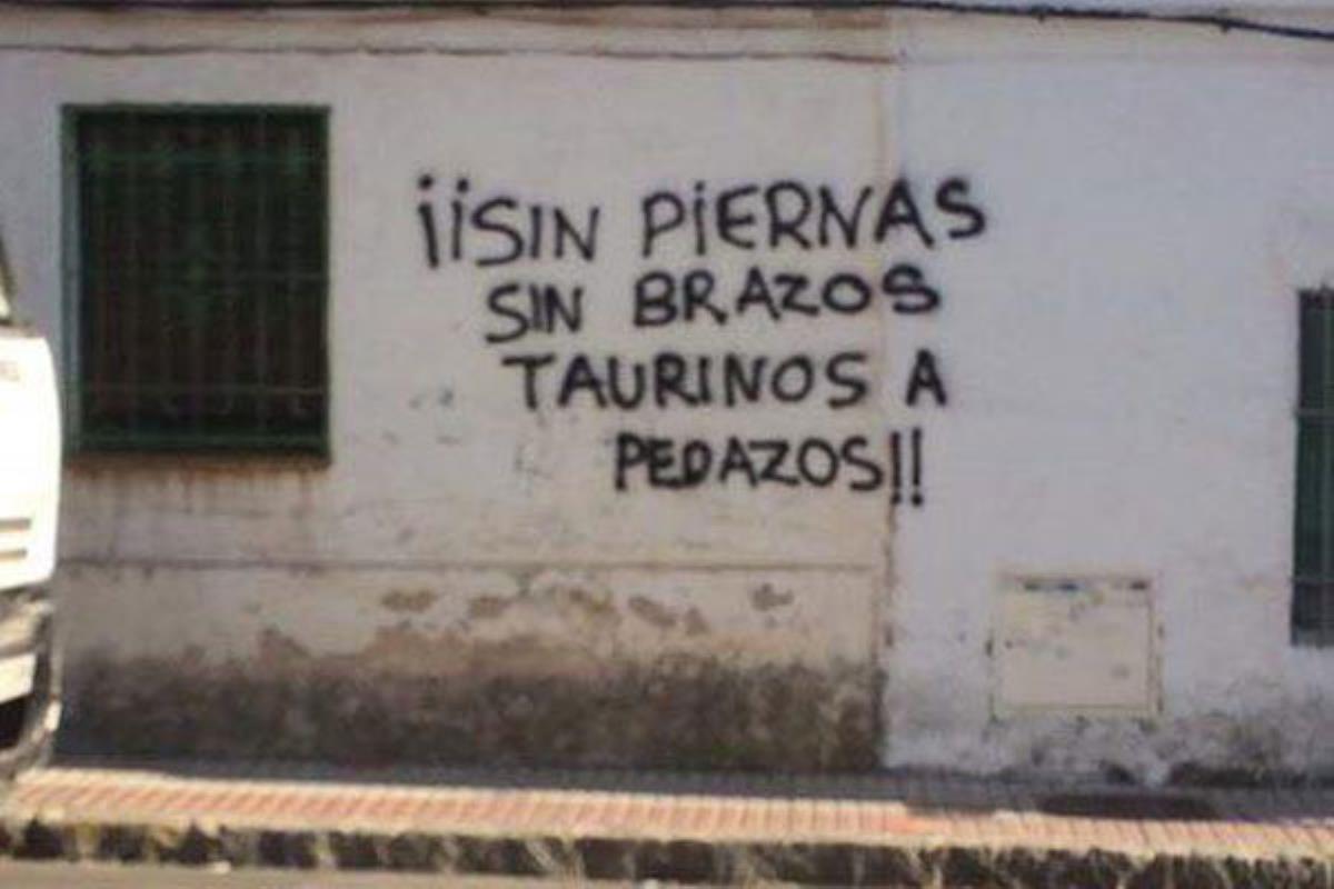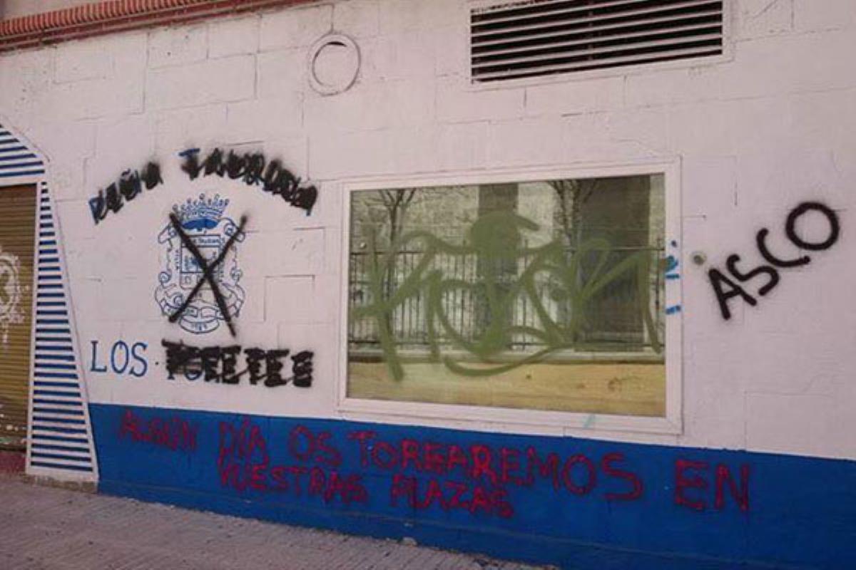 Parece que la marcha convocada por la Federación de Asociaciones Taurinas Culturales de Fuenlabrada no ha sentado del todo bien a algunos de los sectores antitaurinos. Y es que horas después de conocer la decisión de la Delegación del Gobierno de Madrid de autorizar la manifestación, han aparecido varias pintadas en las fachadas de las sedes de las peñas taurinas de Fuenlabrada, donde se podían leer frases como “Sin piernas, sin brazos. Taurinos a pedazos”, “Asesinas” o “Al taurino marichulo, una lanza por el culo”.