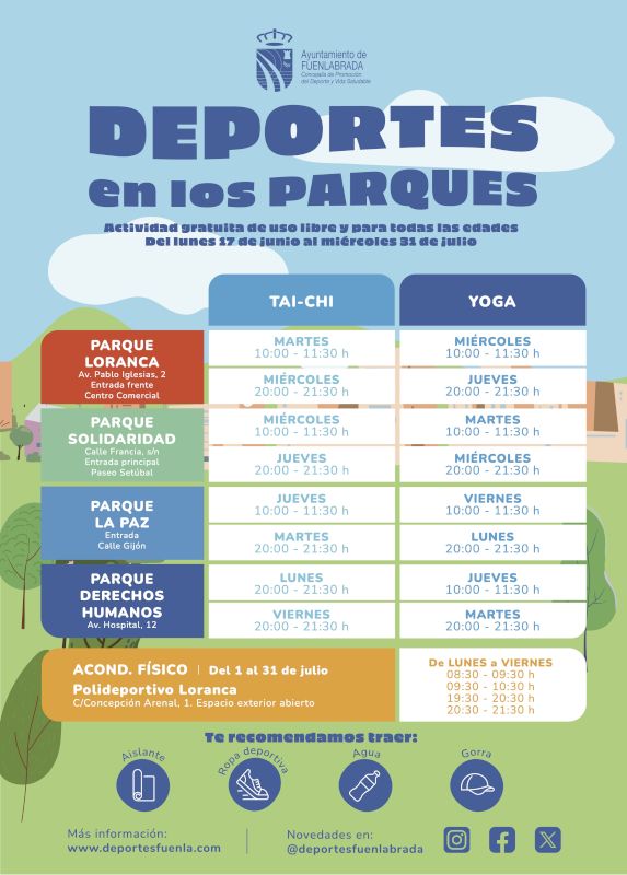 Con la llegada de la época estival, el Ayuntamiento de Fuenlabrada pone en marcha una nueva edición de "Deporte en los Parques", una iniciativa que tuvo una muy buena acogida entre los vecinos y vecinas. Se trata de un programa por el que se puede practicar, de manera gratuita, actividades físicas durante los meses de junio y julio en determinados parques.