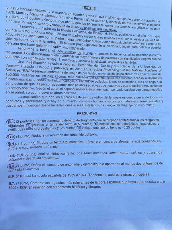 Las preguntas sobre el texto consistían en elaborar el mencionado comentario de texto, redactar un resumen del contenido, elaborar un texto argumentativo, analizar sintácticamente una frase, definir antonimia y dar dos ejemplos de antónimos de ‘Universal’. El examen se completaba en esta opción con una pregunta sobre la novela española entre 1934 y 1974 y, por último, se cuestionaba sobre los aspectos más relevantes de la obra española que haya leído el alumno, escrita entre 1900 y 1939.