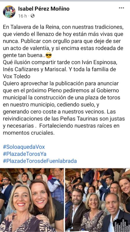 Pérez manifiesta que “en Vox dimos un paso al frente tras las Fiestas, tras escuchar a las peñas, lo confirmamos el domingo 25 de septiembre con el anuncio de que llevaríamos una propuesta para sacar adelante las pretensiones de las peñas sin que ello suponga un coste para los fuenlabreños”. Pérez ha añadido que “ahora lo que queremos es que los partidos que siempre se han posicionado a favor de respetar y conservar las tradiciones de nuestra ciudad, trabajemos de forma conjunta para sacar adelante una propuesta en la que la tauromaquia, la cultura, el arte, la ciudad y los fuenlabreños salgan beneficiados”.