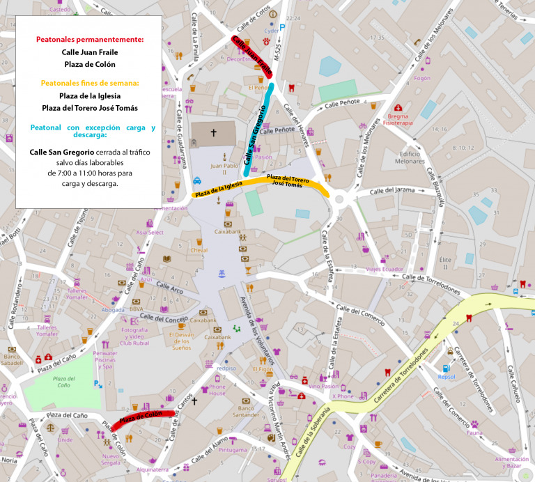 Plaza de la Iglesia y Plaza del Torero José Tomás: Debido a la afección a los conductores que ha tenido la peatonalización total de la Plaza de la Iglesia, se propone mantenerla abierta al tráfico de lunes a viernes, y peatonalizarla los fines de semana. Cabe destacar que el mayor uso de la plaza y de este espacio se produce los fines de semana, ya que es cuando mayor número de personas acuden a ella y mayor ocio tiene el entorno.