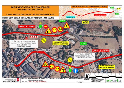 Carretera M-519, entre la M-510 y la Avda. de los Voluntarios, durante un periodo aproximado de 10 días, desde el 1 de junio de 2023 hasta el 10 de junio de 2023.