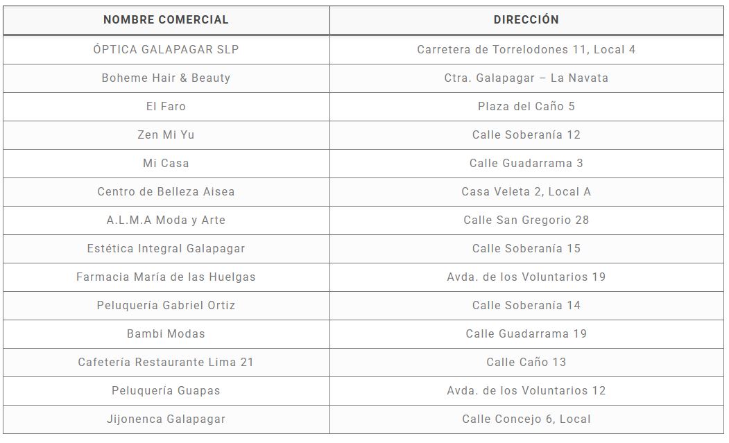 Los catorce comercios inscritos en esta edición son: Óptica Galapagar SLP, Boheme Hair & Beauty, El Faro, Zen Mi Yu, Mi Casa, Centro de Belleza Aisea, A.L.M.A Moda y Arte, Estética Integral Galapagar, Farmacia María de las Huelgas, Peluquería Gabriel Ortiz, Bambi Modas, Cafetería Restaurante Lima 21, Peluquería Guapas y Jijonenca Galapagar.