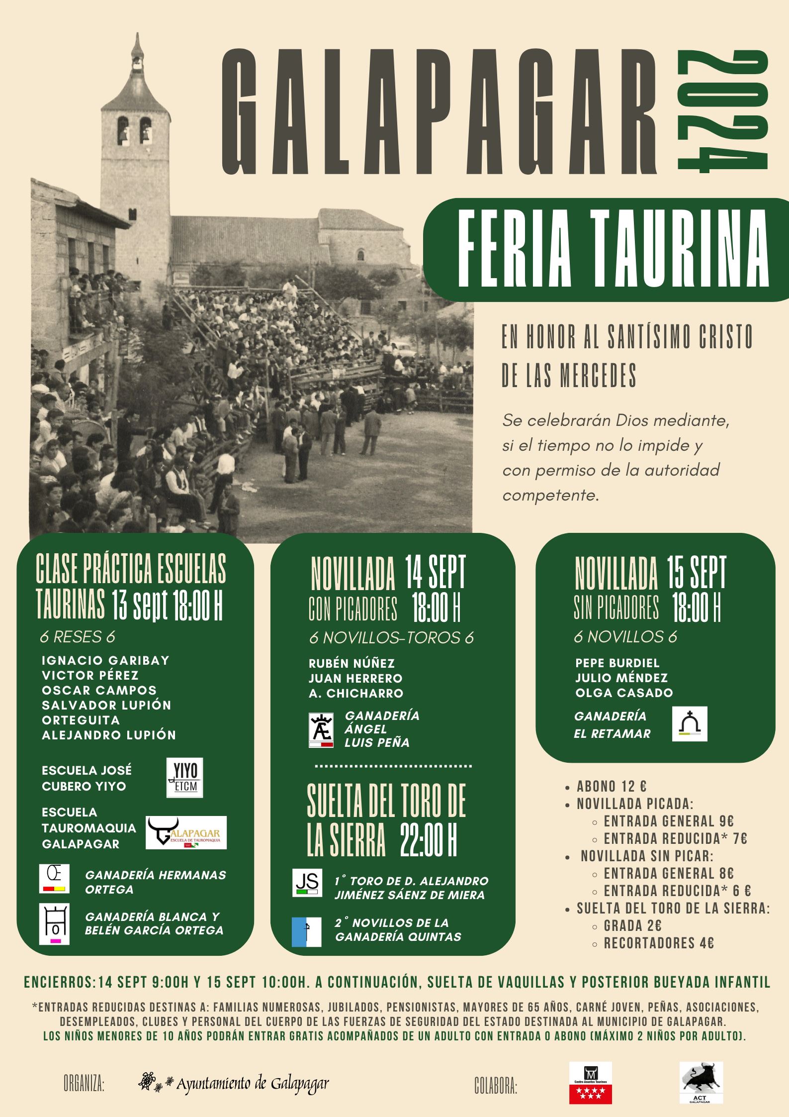 La primera novillada con picadores será el 14 de septiembre, día del patrón de Galapagar, con la presencia de novilleros que están en un gran momento de su carrera como son Juan Herrero y Rubén Núñez. Destacando a Alejandro Chicharro, a punto de tomar la alternativa y que fue vencedor en el circuito de novilladas de la Comunidad de Madrid del pasado año 2023.