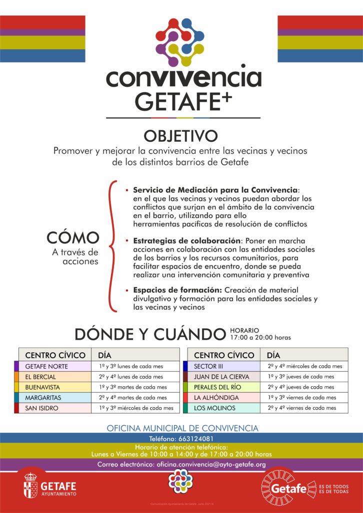 La Oficina de Convivencia es un espacio itinerante entre los diferentes Centros Cívicos de los barrios de Getafe, que tiene presencia dos tardes al mes en cada uno de ellos. Pueden contactar o pedir más información en el teléfono: 663124081, con horario de atención de lunes a viernes de 10:00 a 14:00 y de 17:00 a 20:00 horas. También en el correo electrónico: oficina.convivencia@ayto-getafe.org. De forma presencial se puede acudir de 17:00 a 20:00 horas en los centros cívicos, dos tardes al mes en cada uno de ellos:
