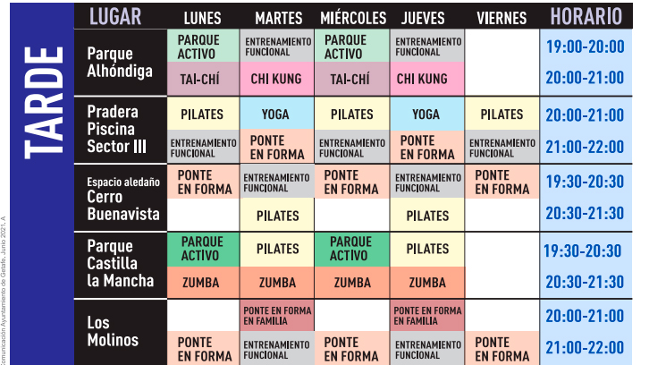 Las clases se desarrollarán con el objetivo de evitar el sedentarismo durante la temporada estival, así como promover la práctica deportiva entre los vecinos en espacios abiertos, evitando así la propagación del virus. Para mantener la seguridad de los asistentes, estos deberán cumplir las estrictas medidas de seguridad sanitarias, como la distancia interpersonal, el uso obligatorio de la mascarilla, la utilización del gel hidroalcohólico... Los horarios y días de las clases podrás consultarlas en las siguientes imágenes: