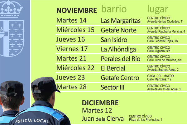 Este programa de charlas está previsto para empezar este martes, 14 de noviembre, serán la Policía Local y el Cuerpo Nacional de Policía quienes las lleven a cabo, organizado por el Ayuntamiento de Getafe. Es una nueva edición, la anterior tuvo lugar el año pasado y, en ella, participaron más de 1.200 vecinos y vecinas.