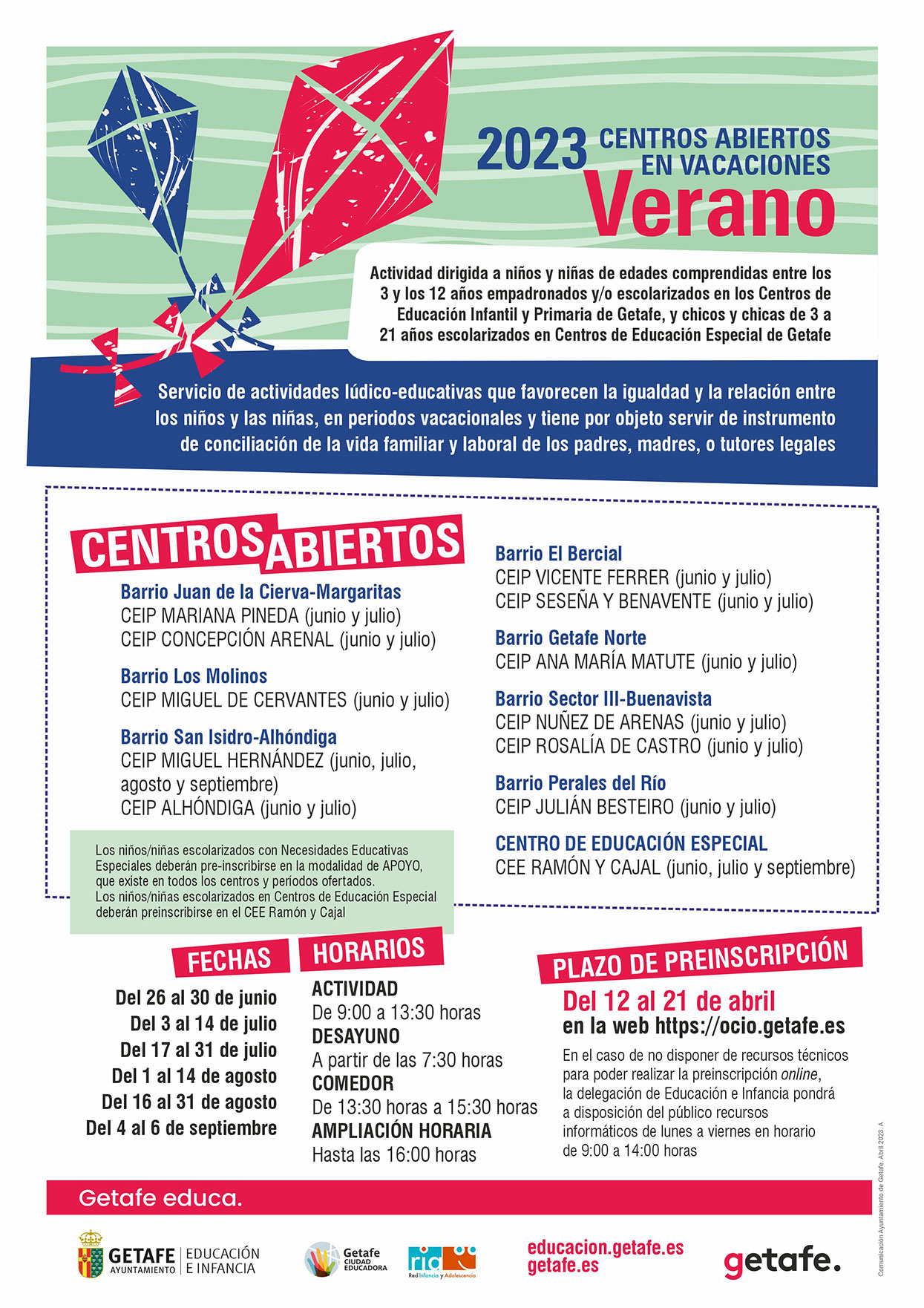Podrán hacer uso de este servicio los alumnos de entre 3 y 12 años escolarizados en centros de Educación Infantil y Primaria de Getafe (con edades de 3 a 21 en el caso de Educación Especial) o empadronados en el municipio. La preinscripción deberá realizarse antes del 21 de abril en la modalidad online, a través de la web ocio.getafe.es. Aquellas personas que no dispongan del usuario y contraseña, pueden solicitarlo en los correos educacioninfancia@ayto-getafe.org o vacacionesescolares@ayto-getafe.org. Si anteriormente han participado en alguna actividad municipal, ya disponen de las claves requeridas. En el caso de no disponer de recursos técnicos para poder realizar la preinscripción telemáticamente, la delegación de Educación pondrá a disposición del público recursos informáticos de lunes a viernes, en horario de 9:00 a 14:00 horas. Toda la información se encuentra a disposición de las familias en la página web municipal www.getafe.es, en la página de Educación https://educacion.getafe.es/ y en los centros escolares.