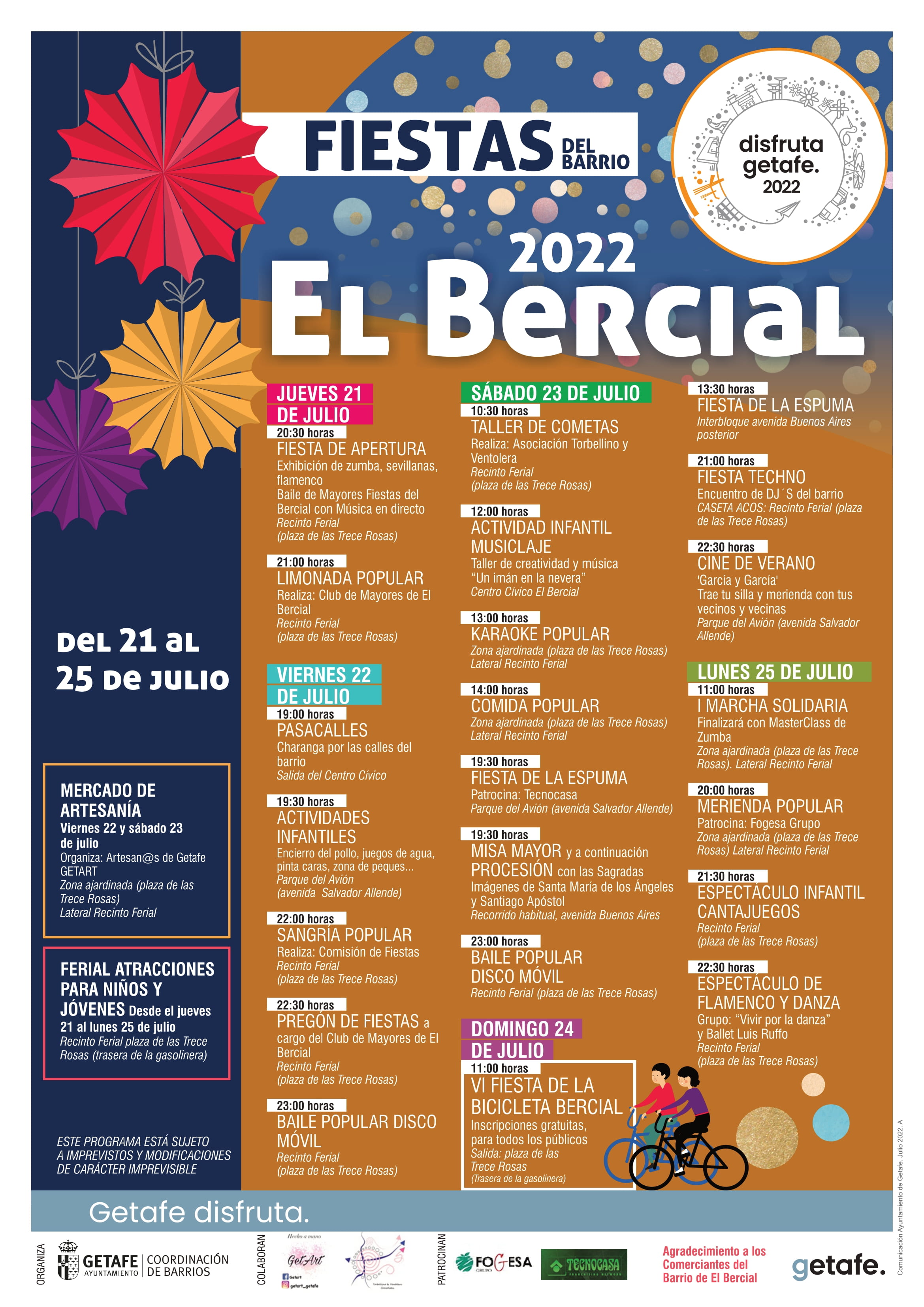 La mayor parte de las actividades se llevarán a cabo en el Recinto Ferial del barrio, situado en la plaza de las Trece Rosas. El viernes a partir de las 22:30 horas, el Club de Mayores de El Bercial será el encargado de dar el pistoletazo oficial de las fiestas con la lectura del pregón.