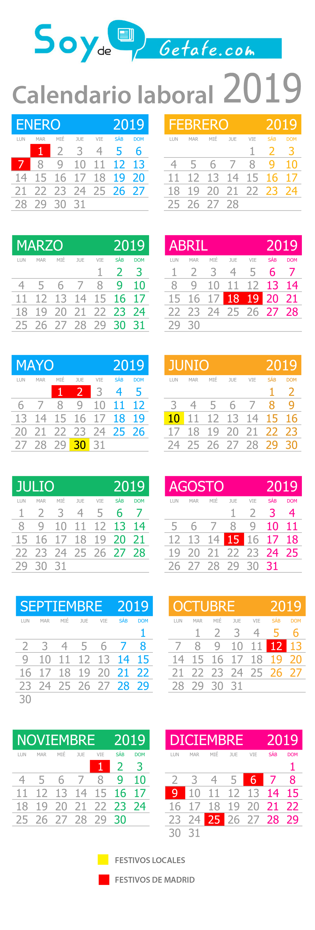 Hace unos días ya teníamos disponible el Calendario Laboral de la Comunidad de Madrid, y ahora ya disponemos de todos los días festivos de Getafe de 2019. Os hemos realizado un único calendario con todos los días de fiesta y puentes que tendrías en Getafe.