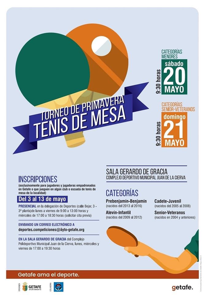 Desde ya, y hasta el 13 de mayo, puedes inscribirte para participar en este torneo organizado con la colaboración del Club Tenis de Mesa Getafe.