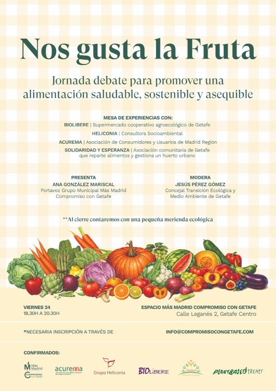 Getafe será escenario el próximo 24 de abril de una jornada dedicada a la alimentación sostenible, saludable y accesible bajo el título “Nos gusta la fruta: una dieta saludable, sostenible y asequible”, organizada por Más Madrid Compromiso con Getafe. El encuentro se celebrará entre las 18:30 y las 20:30 horas en su local de la calle Leganés número 2, en Getafe Centro.