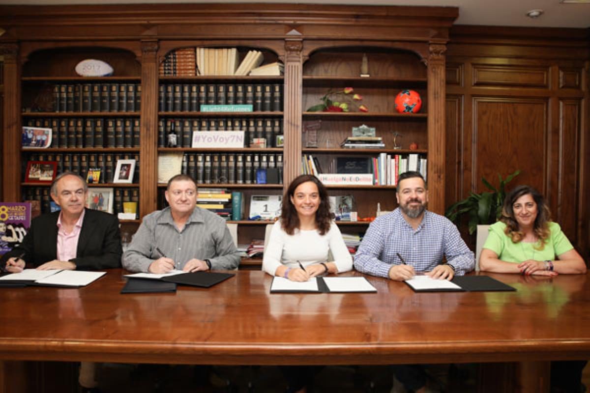 La alcaldesa, Sara Hernández, junto a la concejala de Desarrollo Económico, Nieves Sevilla, firmó estos convenios con los representantes de AJE, Marcos Avellaneda; ACOEG, Alejandro Rodríguez, y de ASALMA, Julián A. Menéndez, entidades que llevarán a cabo estos proyectos dotados de 200.000 euros.