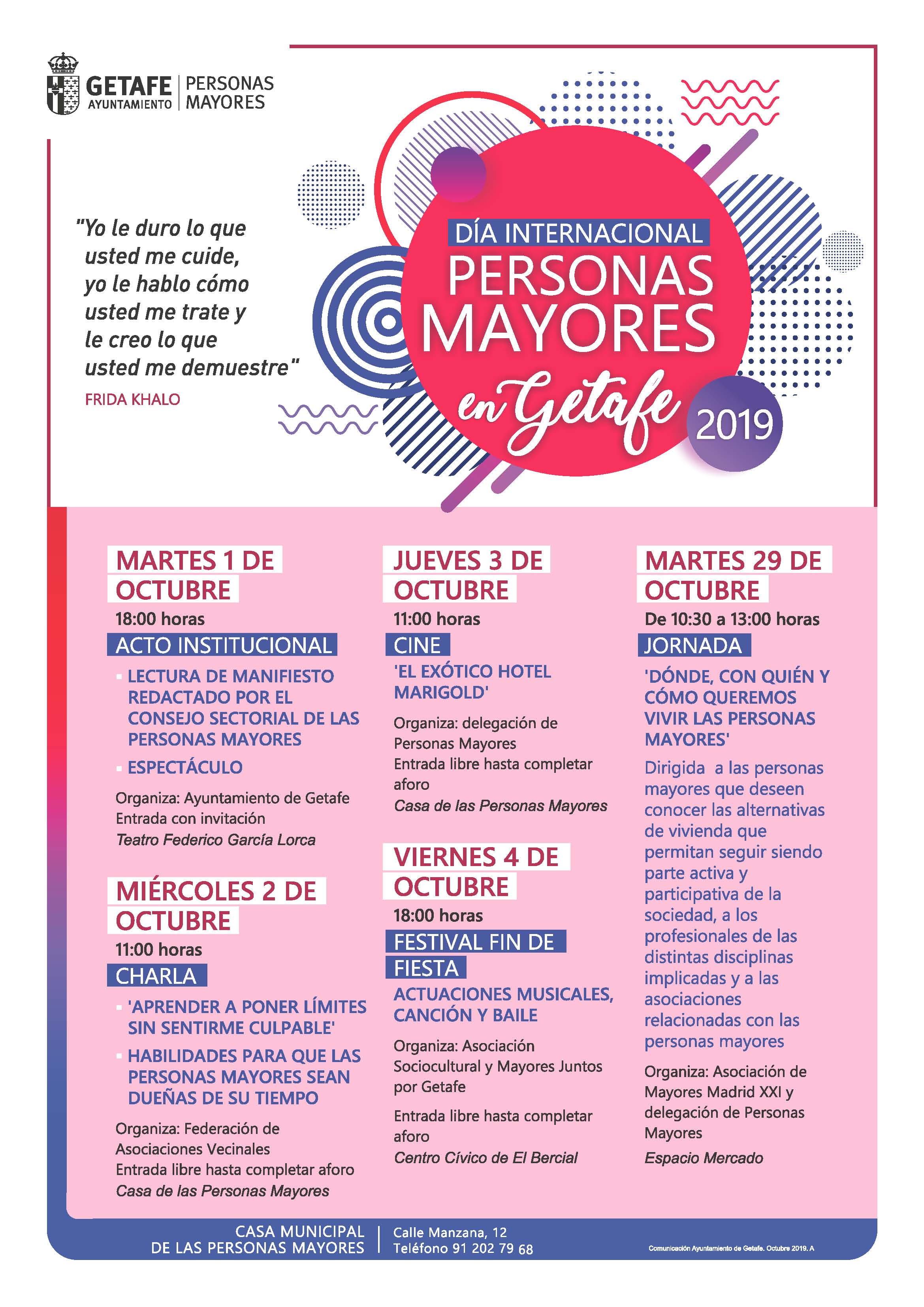 El próximo 1 de octubre celebramos el Día Internacional de las Personas Mayores, y en Getafe nos sumamos a esta fecha conmemorativa con un acto en el Teatro Federico García Lorca en el que se leerá un manifiesto a cargo del Consejo Sectorial de las Personas Mayores y se disfrutará de un espectáculo. A partir de ese día y hasta el viernes, la ciudad se volcará con nuestros mayores con actividades como una charla y jornada, cine y un festival de fin de la fiesta.