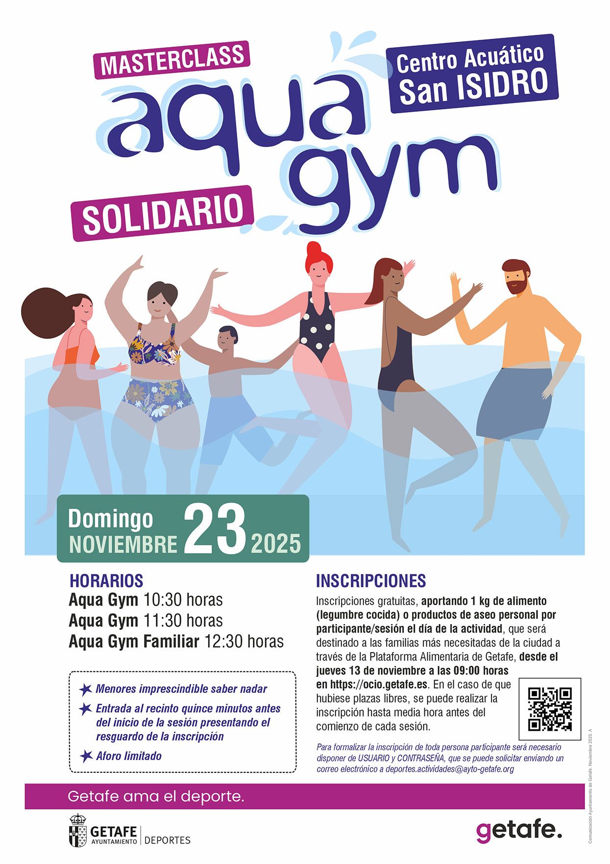 El Ayuntamiento de Getafe ha organizado para el domingo 23 de noviembre una Masterclass de Aqua Gym Solidario que se celebrará en el Centro Acuático San Isidro a las 10:30, 11:30 y 12:30 horas.