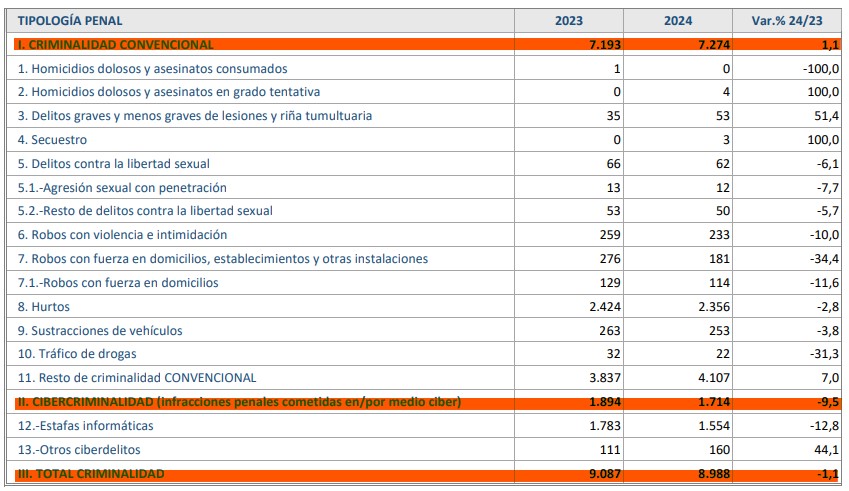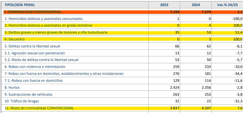 La criminalidad convencional ha pasado de 7.193 delitos en 2023 a 7.274 durante el año pasado