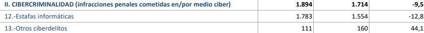 Según se puede comprobar en el propio informe del Ministerio -al que ha tenido acceso este medio y es público para cualquier ciudadano que quiera consultarlo- es cierto que las estafas informáticas han descendido un 12,8% (pasando de 1.783 casos en 2023 a los 1.554 actuales), pero en ese mismo documento se expone también un repunte del 44,1% en el apartado 13 relacionado con otros ciberdelitos como amenazas, coacciones, extorsiones, daños informáticos, revelación de secretos o delitos contra la propiedad intelectual.