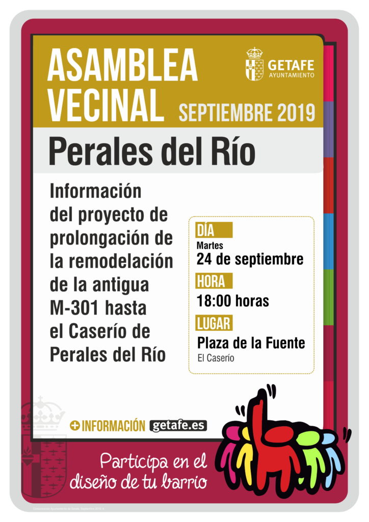 Esta tarde, a las 18:00 horas, tendrá lugar una Asamblea Vecinal para los vecinos y vecinas de Perales del Río con el fin de informar sobre el proyecto de prolongación de la remodelación de la antigua M-301 hasta El Caserío. Desde el gobierno local se ha invitado a acudir a la plaza de la Fuente, en El Caserío, a todos los interesados en este proyecto para resolver las dudas.