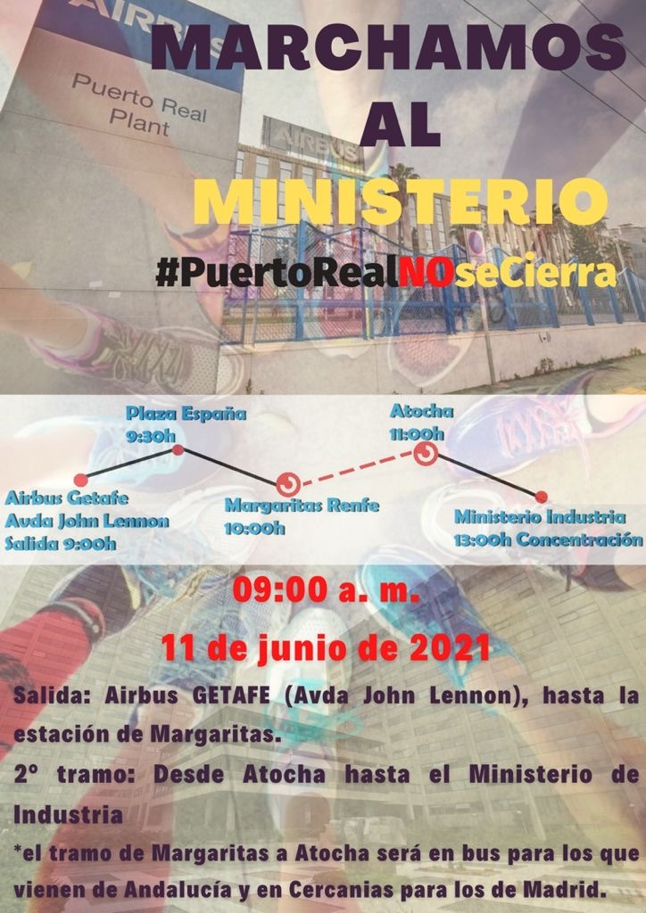 La marcha comenzará a las 9:00 horas de la puerta Norte de la factoría en Getafe (Avenida John Lennon s/n), cruzando Getafe hasta la parada de Renfe de las Margaritas, allí se desplazaran en tren o autobuses hasta Atocha para continuar la marcha (11:00 horas) hasta el Ministerio de Industria.