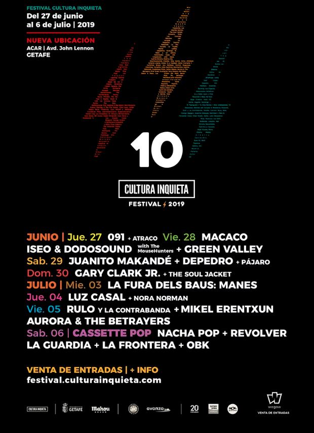 El Festival Cultura Inquieta celebra este 2019 su décima edición. A lo largo de esta década ha logrado consolidarse como uno de los eventos culturales y musicales de referencia en Madrid Sur. Este año se celebrará entre los días 27 de junio y 6 de julio, diez días en los que la música llenará la localidad de Getafe. Entre los artistas que conforman el cartel, destaca Mikel Eretxun, que presentará su undécimo álbum de estudio en solitario ‘El último vuelo del hombre bala’, un trabajo muy personal. Revólver también presentará su disco-libro ‘Básico IV’, el cual se compone por un CD con 13 temas y un DVD con 18 canciones, dos de ellas inéditas. En él también aparece la grabación de su concierto en el Circo Price de Madrid en el mes de enero.