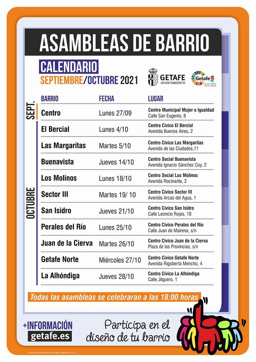 Esta nueva ronda comienza el próximo 27 de septiembre en el barrio de Centro; el 4 de octubre en El Bercial; el 5 en Las Margaritas; el 14 en Buenavista; el 18 en Los Molinos ; el 19 tendrá lugar la de Sector III; el 21 la de San Isidro; el 25 Perales del Río; el 26 en Juan de la Cierva; el día 27 de octubre en Getafe Norte, y el 28 en La Alhóndiga. Todas las asambleas se celebrarán a las 18:00 horas.