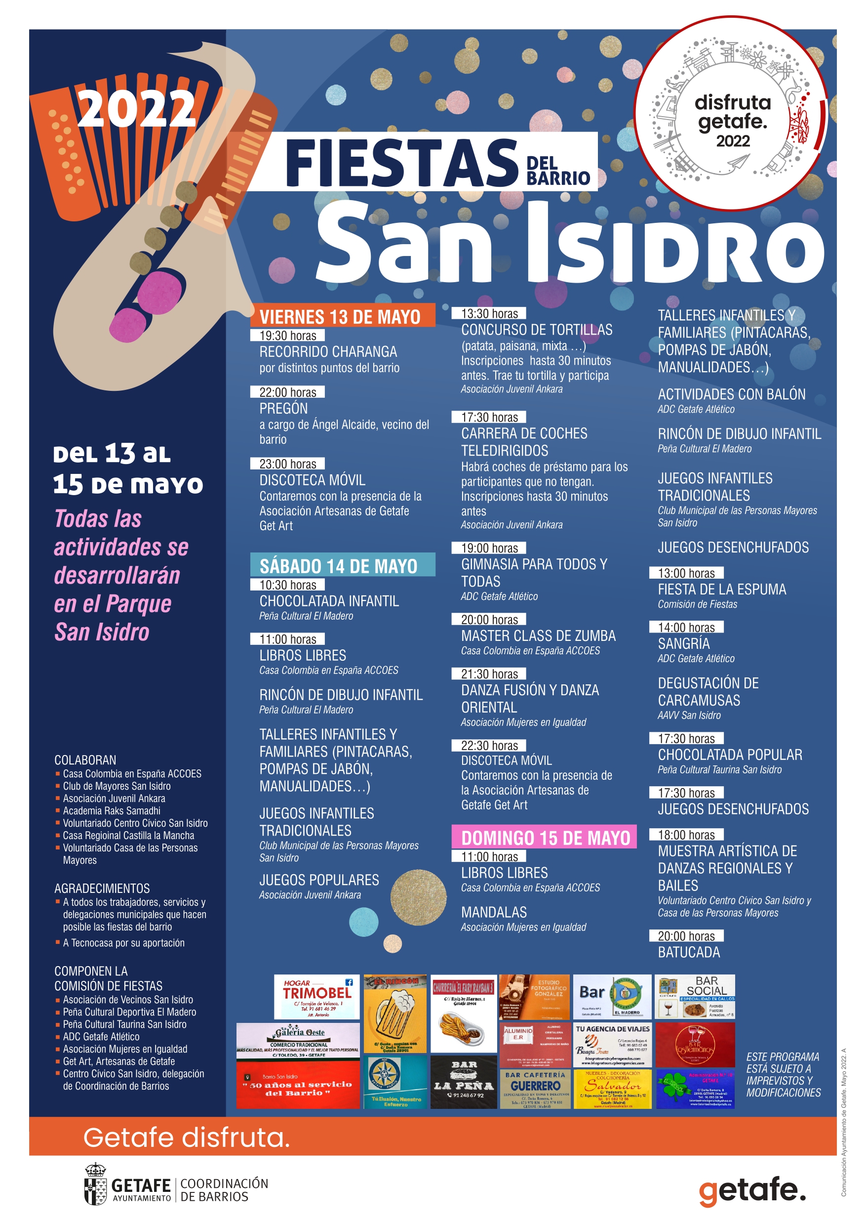 El Ayuntamiento de Getafe recupera las Fiestas de Barrio, tras la pandemia. Comenzarán el próximo fin de semana del 12 al 15 de mayo, por el barrio de San Isidro, con actividades para toda la familia, que tendrán lugar en el Parque San Isidro. Como novedad este año debuta el barrio de Los Molinos, que celebrará por primera vez sus Fiestas, del 7 al 10 de julio.