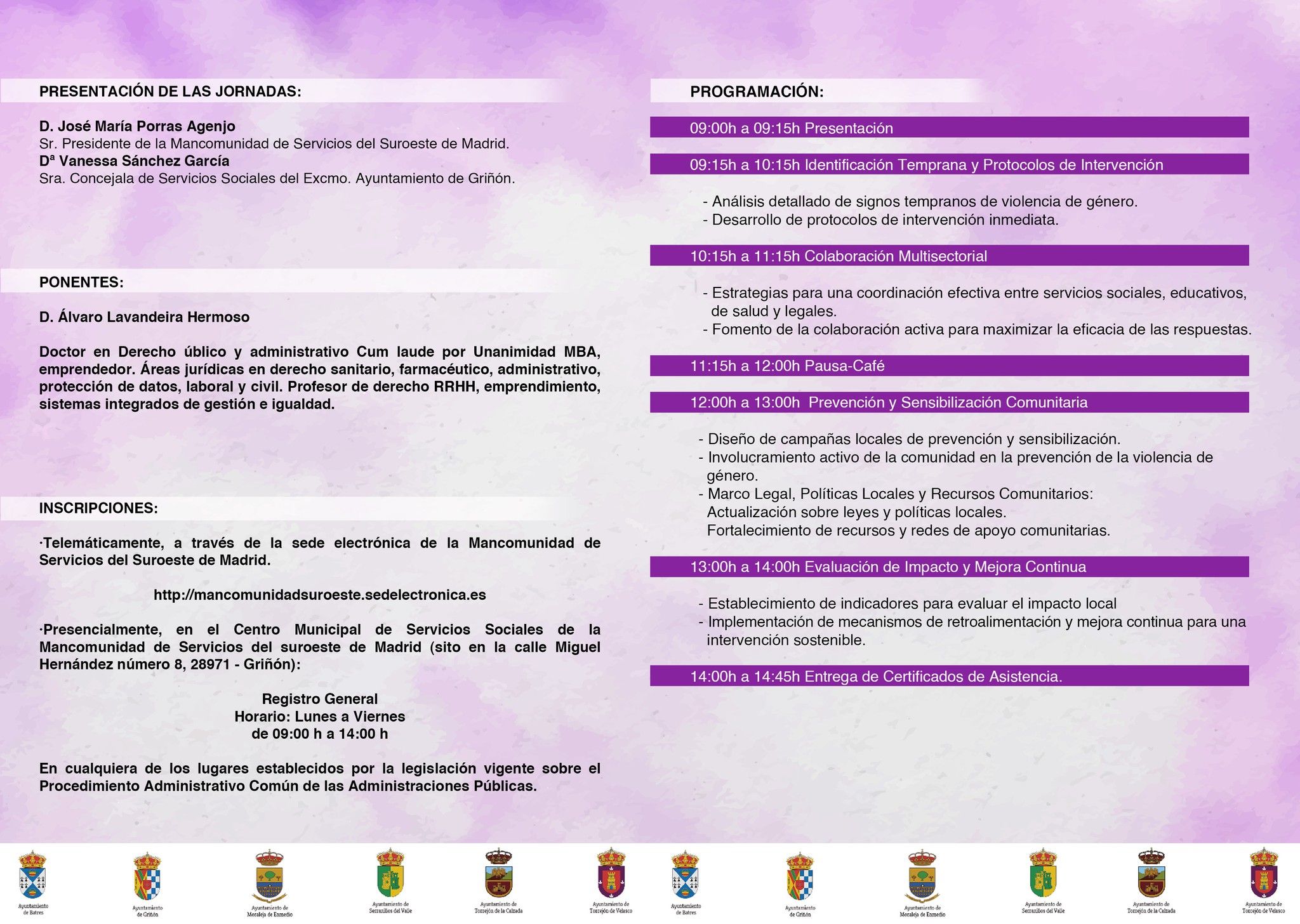 La Mancomunidad de Servicios del Suroeste ha presentado unas jornadas para prevenir la violencia de género tanto doméstica como sexual. Estas jornadas van en la línea de las actividades organizadas para el 8-M, y contará con la presencia del presidente de la Mancomunidad de Servicios del Suroeste y alcalde de Griñón, José María Porras; y la concejala de Servicios Sociales de Griñón, Vanessa Sánchez García; además de Álvaro Lavandeira Hermoso, doctor en Derecho público.