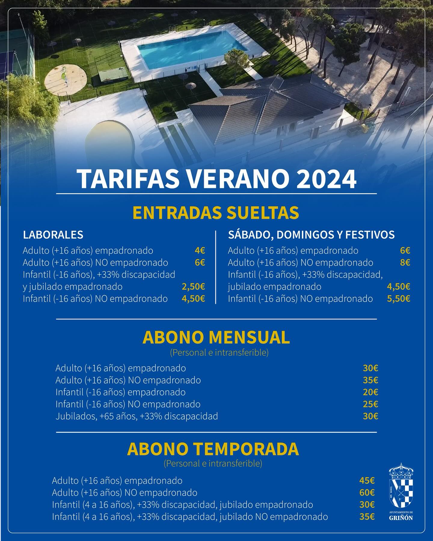 El abono de temporada para los mayores de 16 años será de 45 euros, y de 60 para los no empadronados. Para los niños de 4 a 16 años, jubilados y personas con discapacidad del 33% que sean de Griñón será de 30 euros, mientras que para los no empadronados será de 35 euros. Es importante recalcar que los abonos, tanto el de temporada como el mensual, son personales e intransferibles.