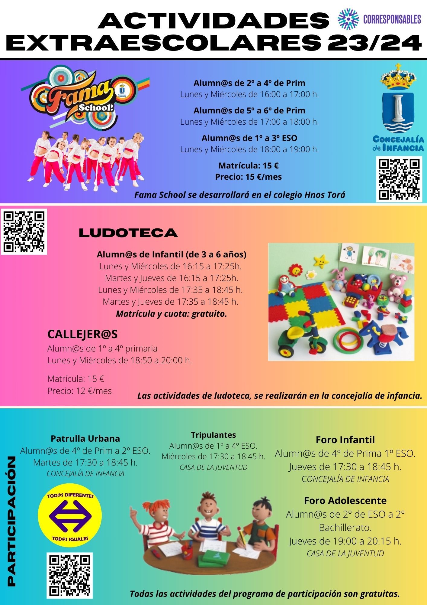 Para este curso escolar, se continúa con el programa de ludoteca, que este curso será gratuito para los alumnos de Infantil, ampliándose el número de grupos. Continúan las actividades de Fama, Callejeros, el servicio de Ocioteca y el programa de Participación Infantil y Adolescente.