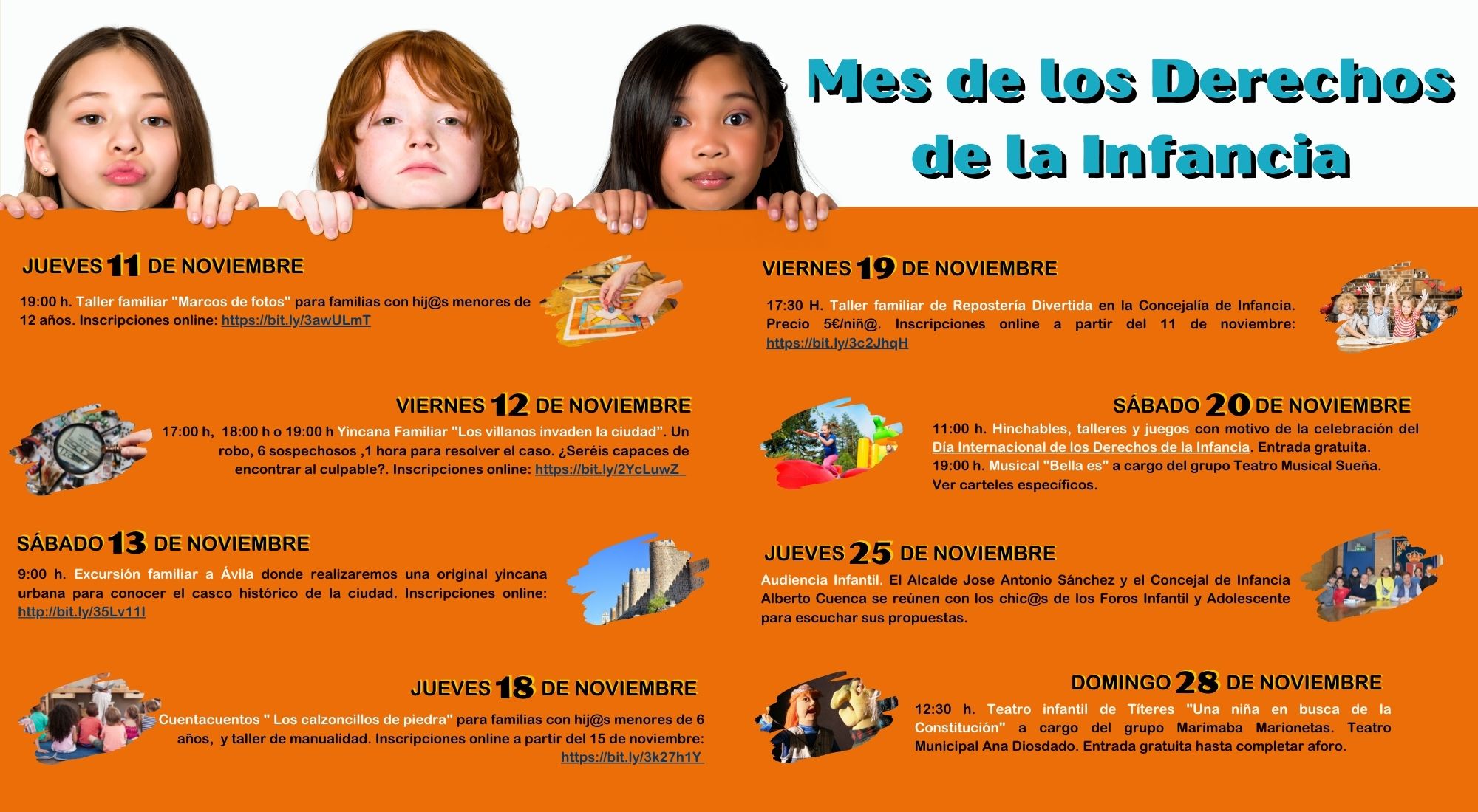 Con motivo del Día Internacional de los Derechos de la Infancia el Ayuntamiento de Humanes de Madrid ha organizado un programa de actividades familiares. La Concejalía de Infancia ha presentado la programación que se ha diseñado en este mes de noviembre para celebrar esta fecha, con numerosos y variados planes. Habrá hinchables, talleres, juegos y musicales. Los vecinos podrán disfrutar de las siguientes actividades: