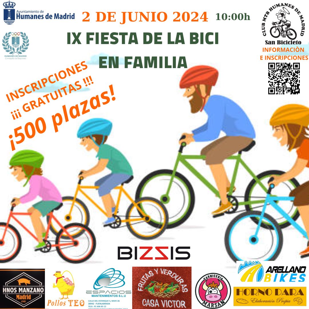 El Club MTB “San Bicicleto”, en colaboración con el Ayuntamiento de Humanes de Madrid, tiene abiertas las inscripciones para participar en la IX Fiesta de la Bici en Familia, que se realizará el próximo 2 de junio. Va dirigida a todos los niños de Humanes de Madrid y de los municipios limítrofes, acompañados de sus padres o familiares, para disfrutar de un fantástico día lleno de sorpresas para niños y adultos.
