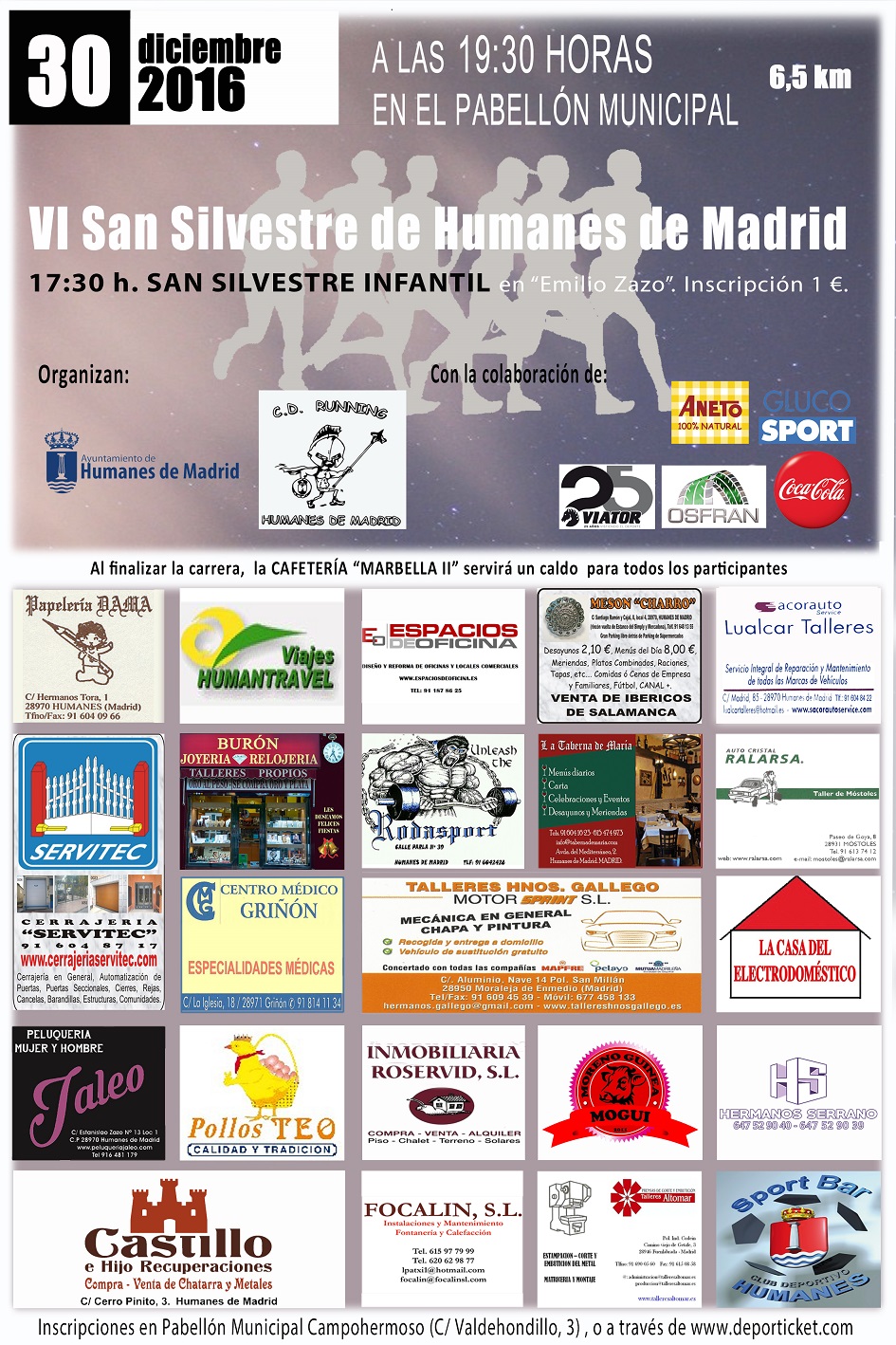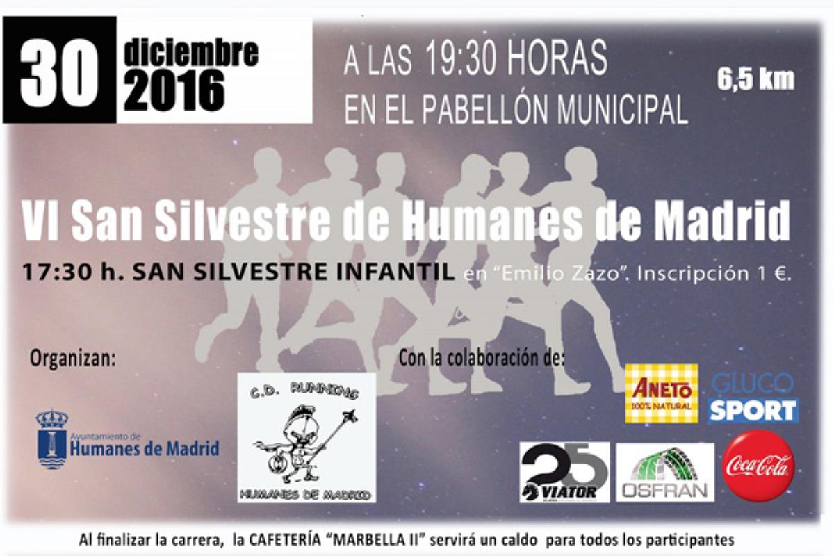 El C.D. Running “Humanes de Madrid” y el Ayuntamiento de Humanes, a través de su Concejalía de Deportes, han organizado la VI San Silvestre, para que todos los humanenses despidamos al año 2016 corriendo.