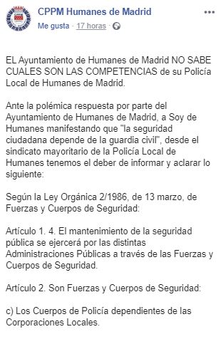 "El ayuntamiento de Humanes de Madrid no sabe cuáles son las competencias de su Policía Local". Así de contundente se mostraban desde el sindicato mayoritario de Policía en el municipio, CPPM. A través de una publicación de Facebook, CPPM Humanes de Madrid se ha visto obligado a recordar a los dirigentes del municipio cuáles son las competencias de las Fuerzas y Cuerpos de Seguridad.