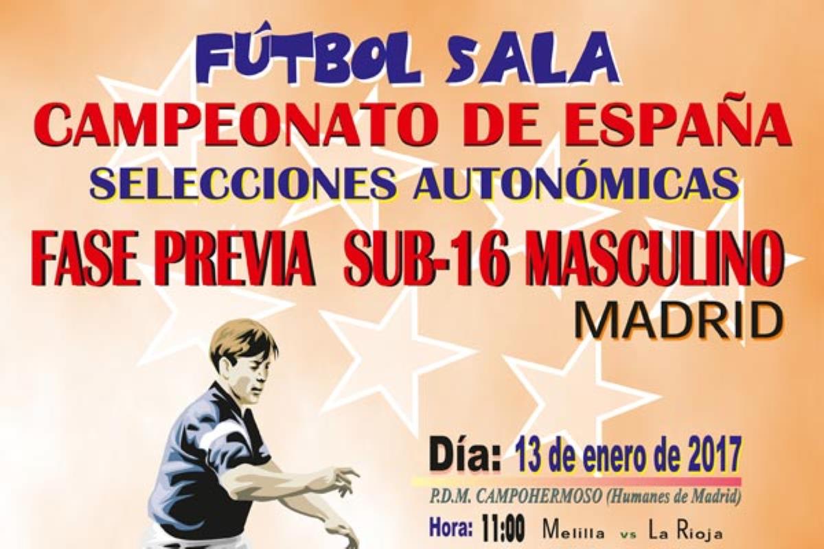 Humanes acogerá del trece al quince de enero la fase previa del Campeonato de España de Selecciones Autonómicas de Fútbol Sala sub-16 masculino. El evento tendrá lugar en el Pabellón Deportivo Municipal Campohermoso de (C/ Valdehondillo, 3). Colaboran La Real Federación Española de Fútbol, la Federación Madrileña de Fútbol Sala, la Comunidad de Madrid, el Ayuntamiento de Humanes de Madrid y el Ayuntamiento de Parla.