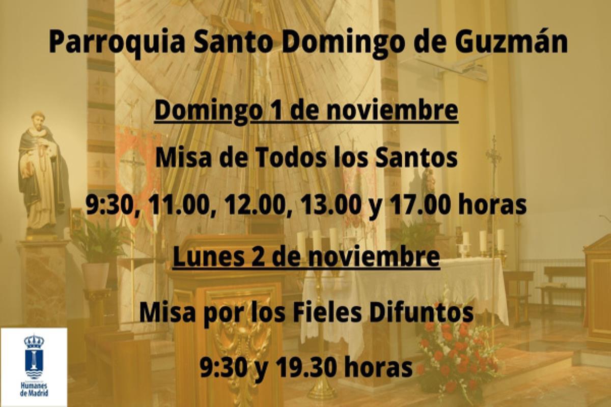 El párroco se encontrará en la puerta del cementerio de Humanes de Madrid para ofrecer el servicio, de manera personal, a aquellas que lo soliciten. El responso se ofrecerá en la tumba o nicho de sus seres queridos. Debido a la situación de pandemia que vivimos por el Covid-19, este año, no se celebrarán misas en el cementerio municipal, pero la Parroquia de Santo Domingo de Guzmán sí acogerá una misa de Todos los Santos el día 1 de noviembre, que será a las 9:30, 11:00, 12:00, 13:00 y 17:00 horas. Después, el lunes 2 de noviembre la misa por los Fieles Difuntos se celebrará por la mañana y por la tarde, a las 9:30 y 19:30 horas.