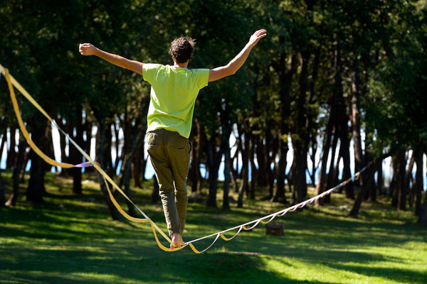 El slackline es una actividad de equilibrio, concentración y destreza, en la que hay que caminar sobre una cinta sujeta a dos puntos fijos que, por lo general, suelen ser árboles.