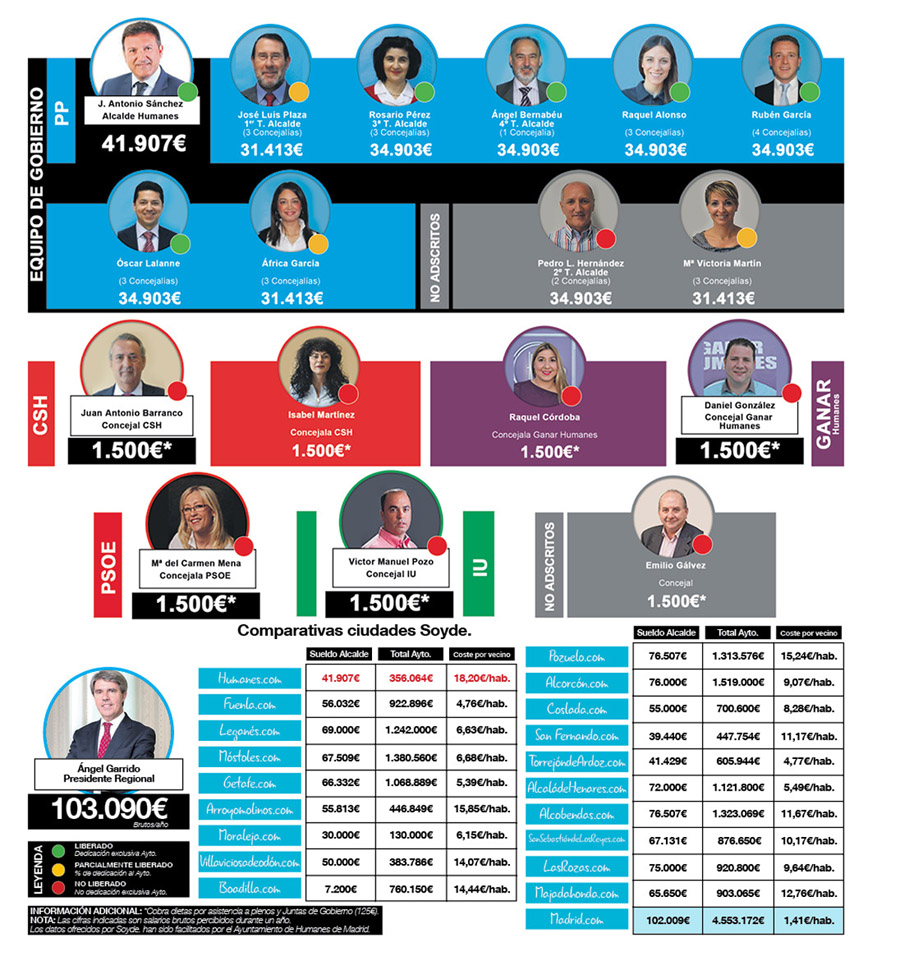 SoydeHumanes.com, de nuevo, ha querido trasladar en este reportaje el salario mensual de todos los concejales que conforman la Corporación municipal de Humanes y el gasto total que supone para las arcas del consistorio el pago de sus retribuciones y lo que pagamos cada ciudadano al año por que dirijan y gestionen nuestra ciudad.