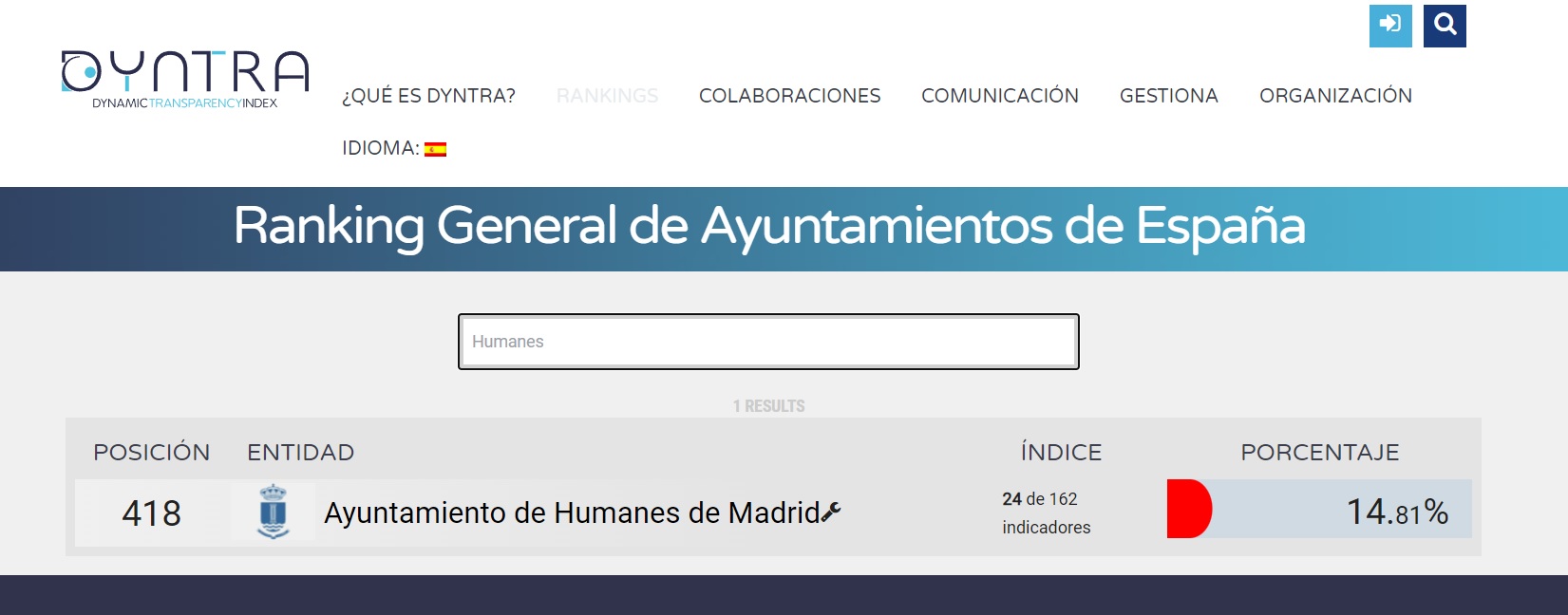Mientras, para Ciudadanos, "Sobre el tema de urbanismo tampoco están dando mucha información”. Según cuenta Alonso, dentro del medidor Dyntra, especializado en esta materia de la publicación de datos por parte de las instituciones, el Ayuntamiento de Humanes presenta aproximadamente un 15% de indicadores de transparencia. Y efectivamente, así es. En este ranking, nuestro Ayuntamiento obedece a 24 de los 162 indicadores.