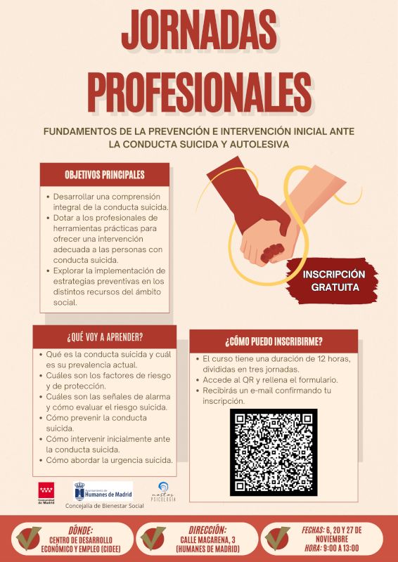 La Concejalía de Bienestar Social del Ayuntamiento de Humanes de Madrid, en colaboración con Nostos Psicología, organiza unas jornadas profesionales gratuitas dirigidas a ofrecer formación especializada sobre los fundamentos de la prevención e intervención inicial ante la conducta suicida y autolesiva.