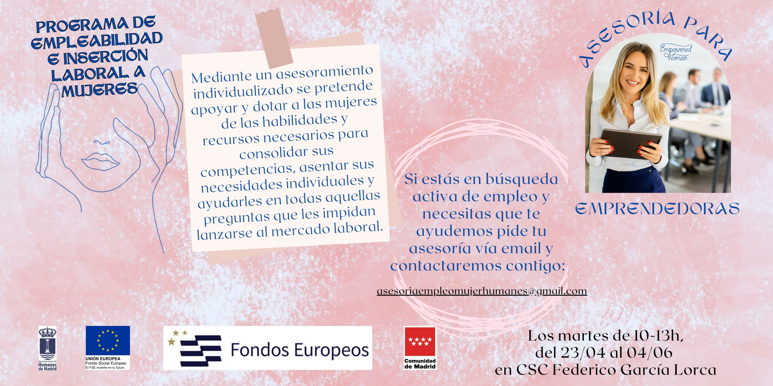 Este servicio de asesoramiento, financiado por los Fondos Europeos y la Comunidad de Madrid, se llevará a cabo los martes, de 10:00 a 13:00, del 23 de abril al 4 de junio, en el Centro Socio-Cultural “Federico García Lorca” (C/ Vicente Aleixandre, 5). Las mujeres en búsqueda activa de empleo que estén interesadas en recibir asesoramiento, deben solicitarlo a través del correo electrónico asesoriaempleomujerhumanes@gmail.com