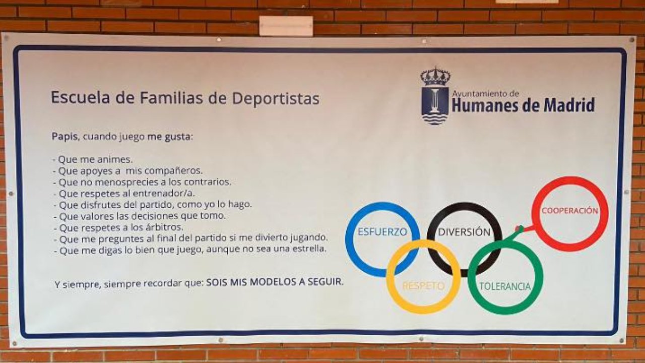 El Ayuntamiento de Humanes de Madrid instala carteles en las instalaciones deportivas como guía de buenas prácticas. La iniciativa pretende concienciar a padres, madres y acompañantes en general, a adoptar una actitud positiva sobre los valores del deporte en los niños.