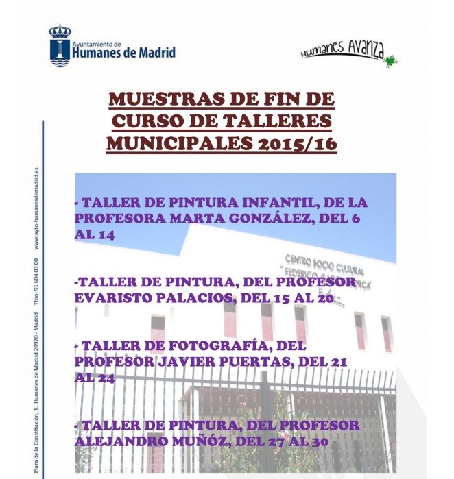 Humanes de Madrid ofrece a los vecinos del municipio una exposición con distintas obras realizadas durante el curso académico por alumnos del Taller de “Pintura Adultos”, que ha impartido Alejandro Muñoz. Esta actividad está organizada por la Concejalía de Cultura, bajo la dirección de Oscar Lalanne.