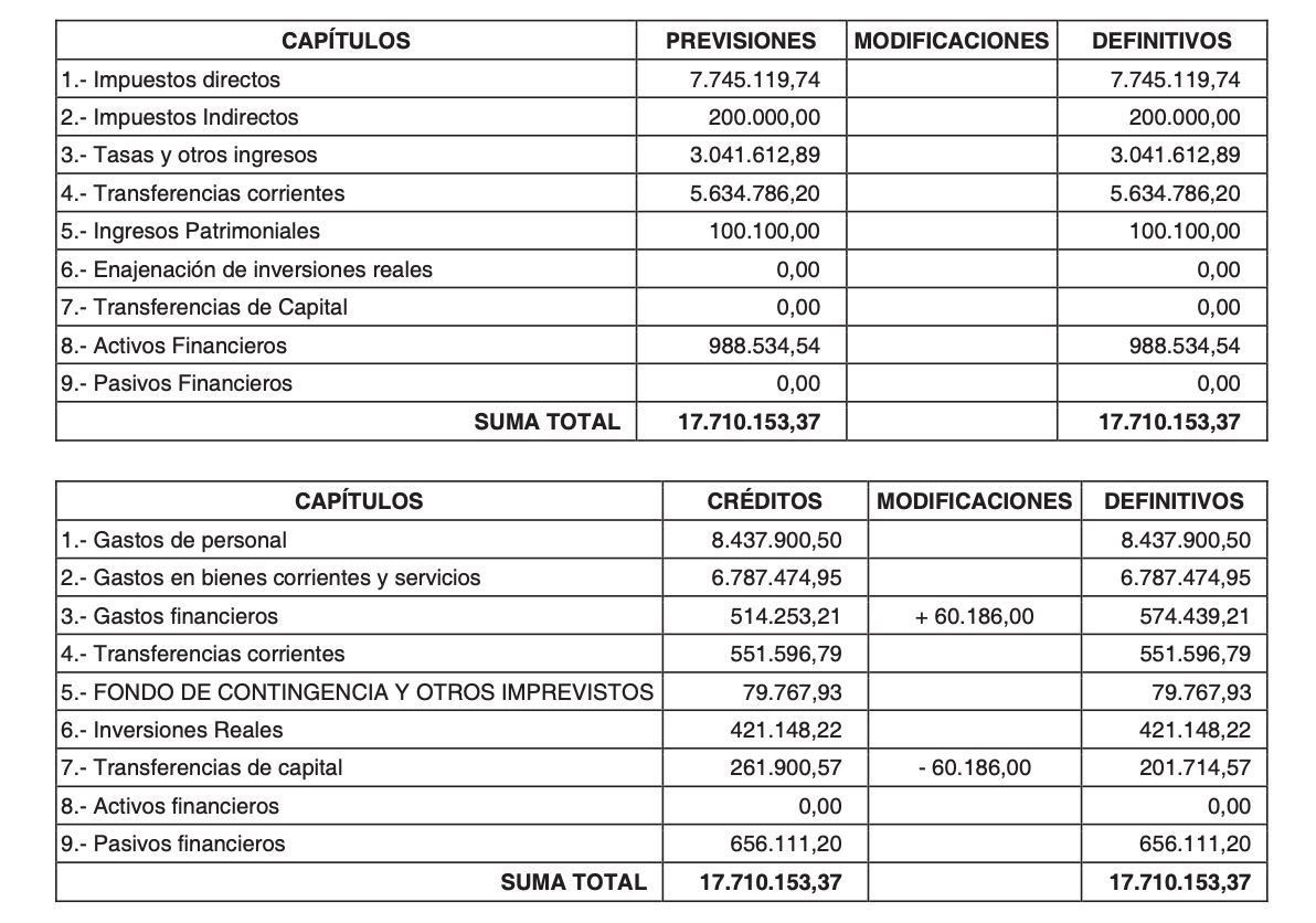 Por su parte, el Ayuntamiento ha tenido que quitar cerca de 60.000 euros en el presupuesto de la "Transferencia de capital", teniendo finalmente un gasto de 201.714,57 euros. Este dinero se ha añadido a los "Gastos financieros"  que tiene, finalmente, un crédito de 574.439,21 euros.